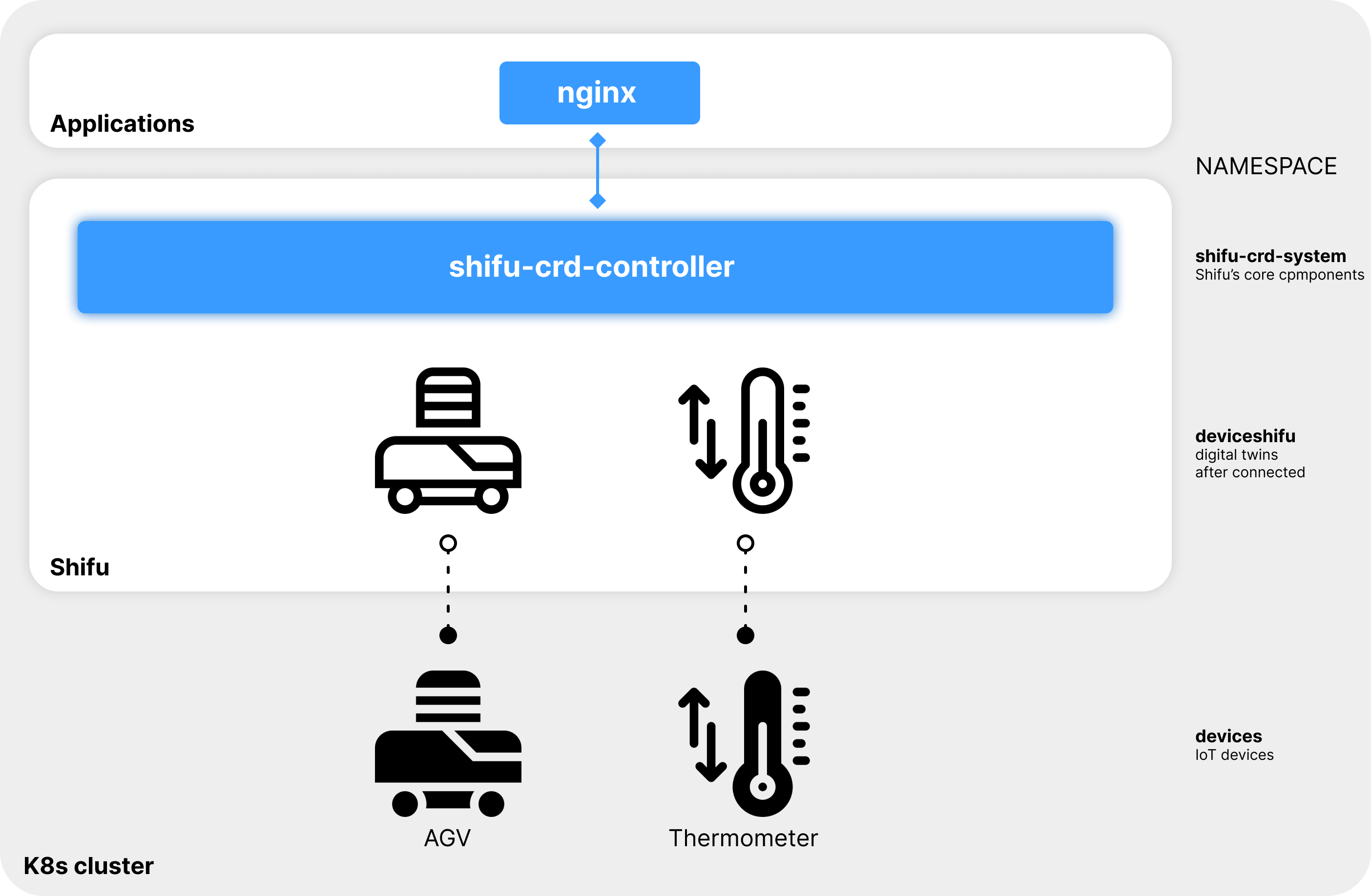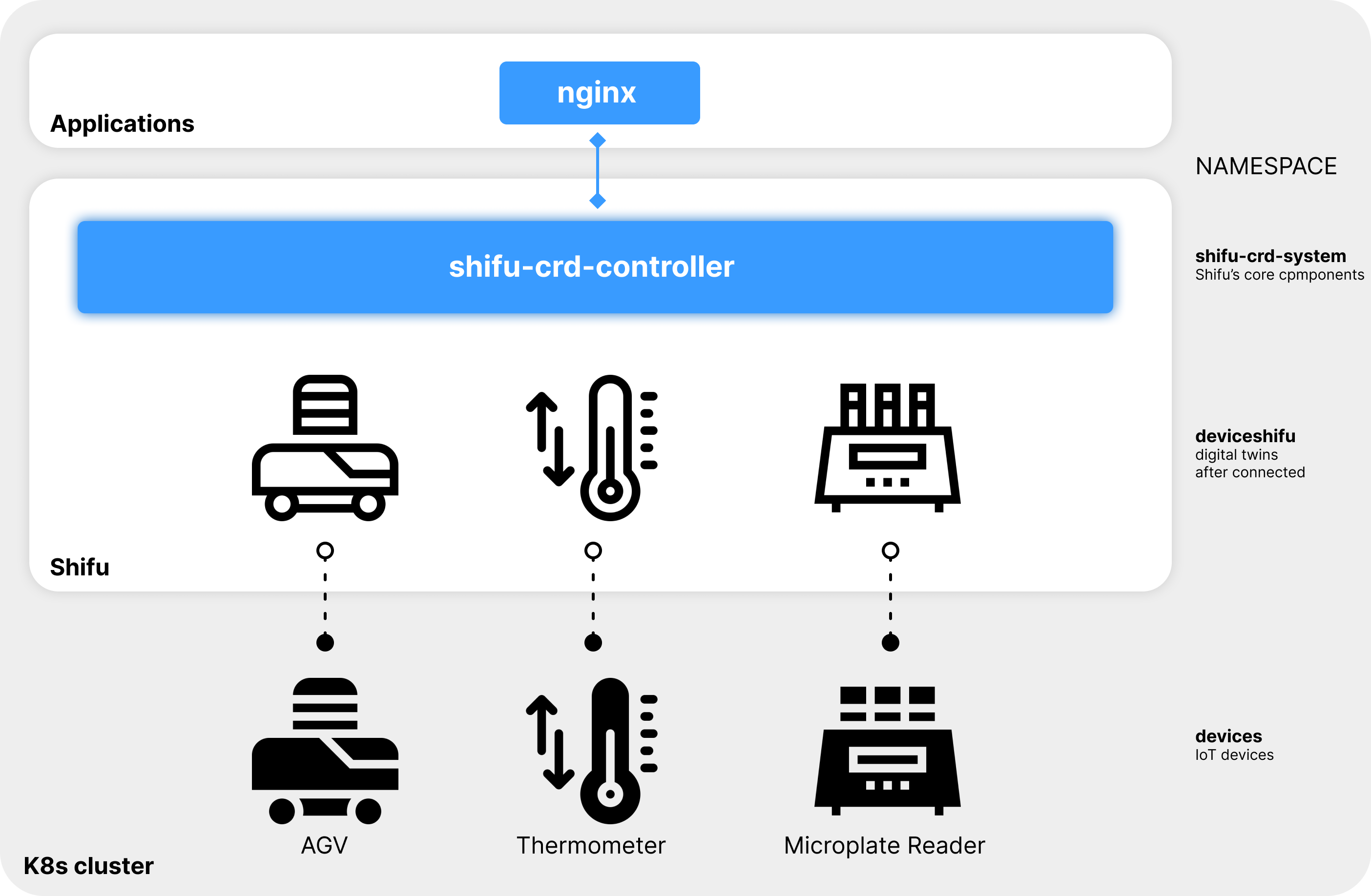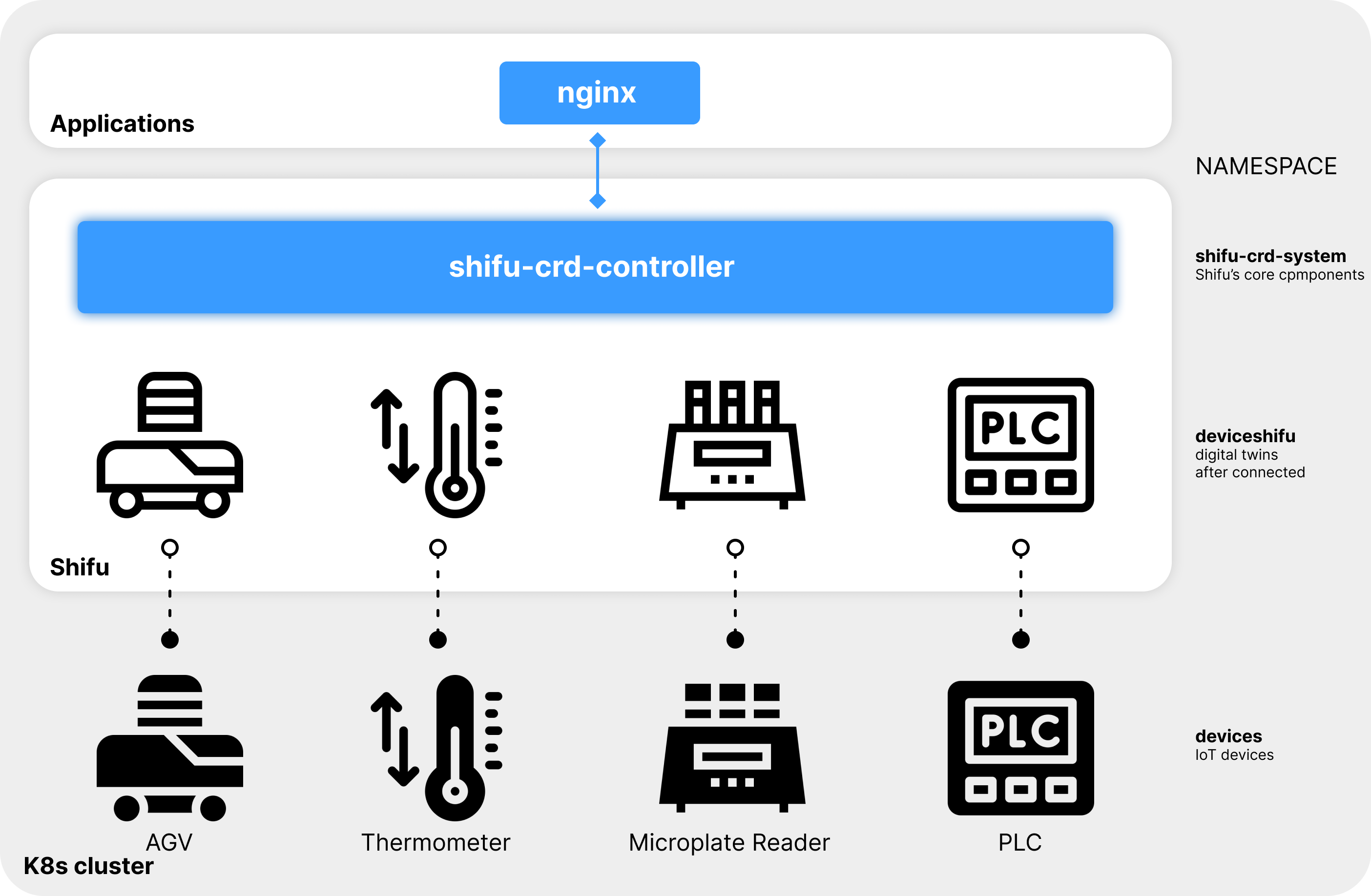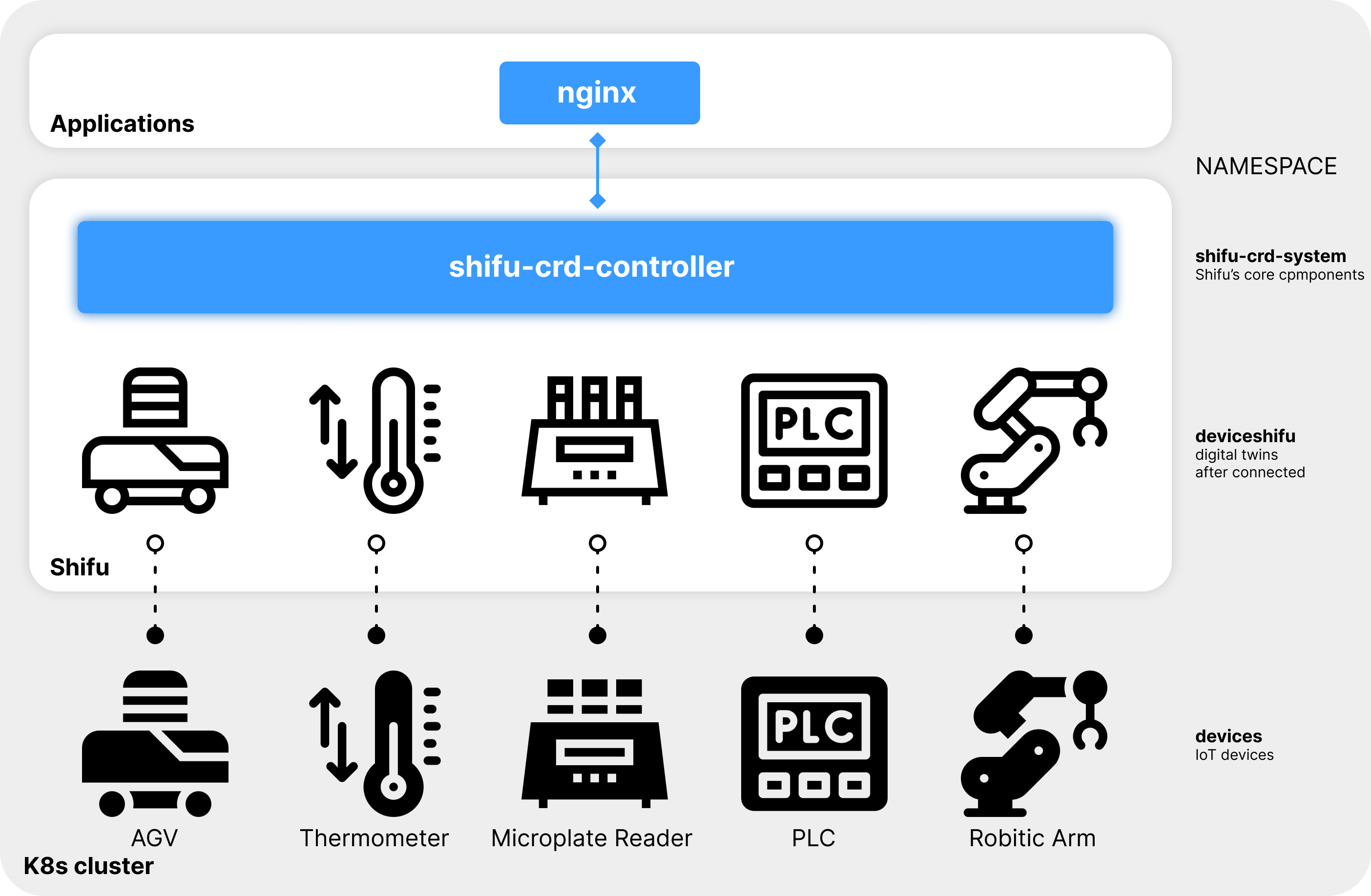 In the actual situation, users of IoT devices use an application or a monitoring platform to interact with the digital twin deviceShifu. Here nginx is an application or a monitoring platform.