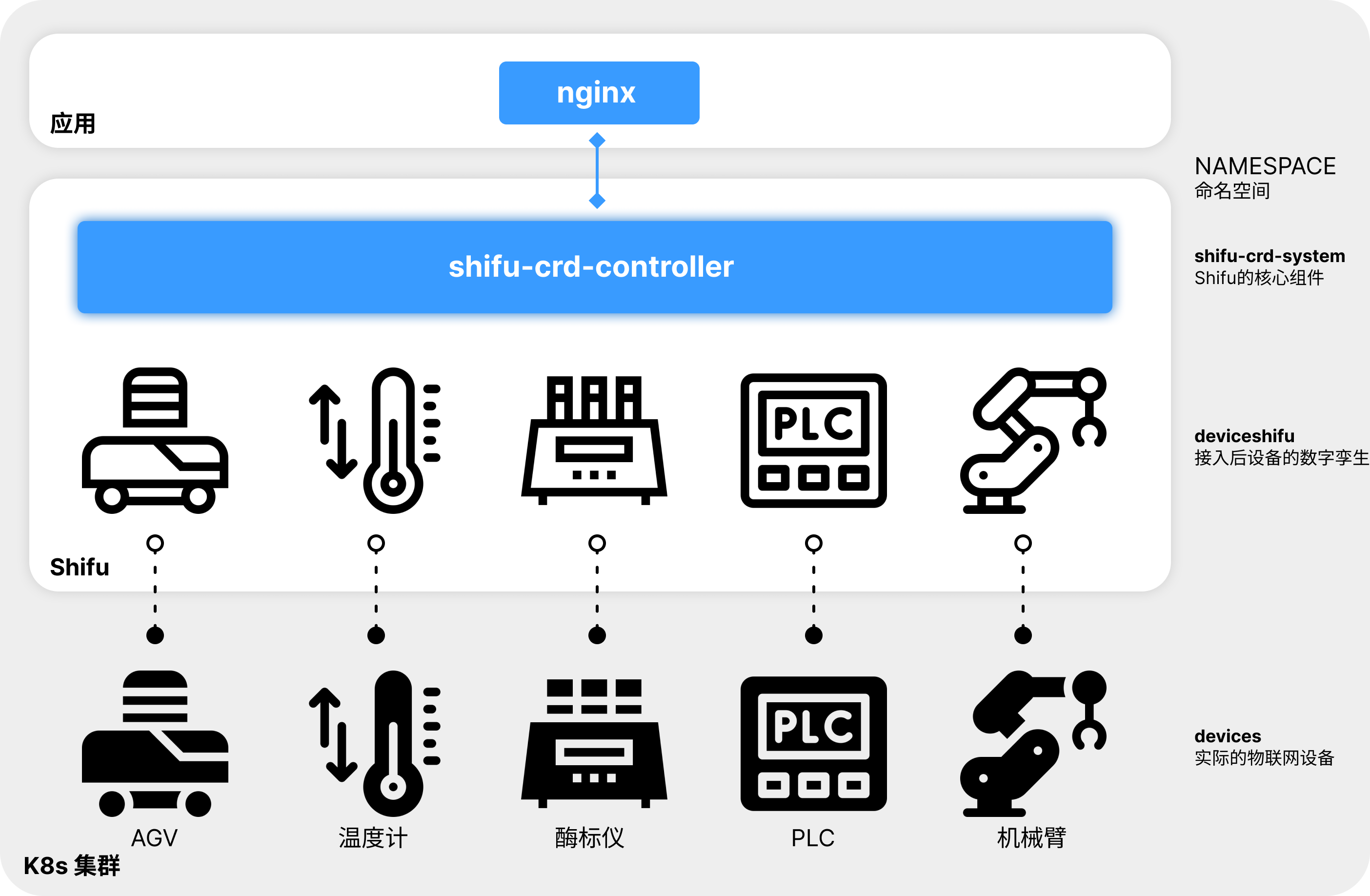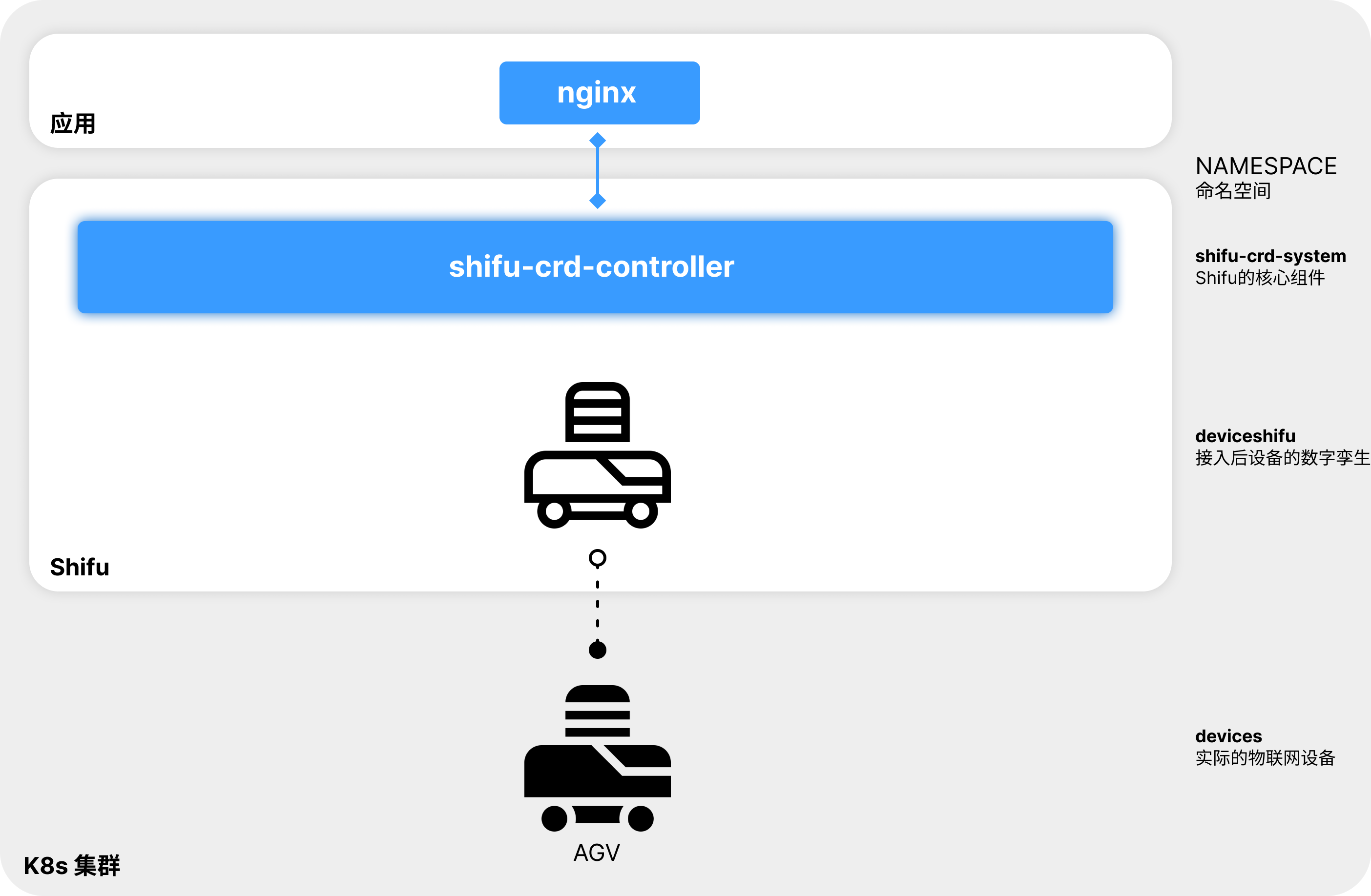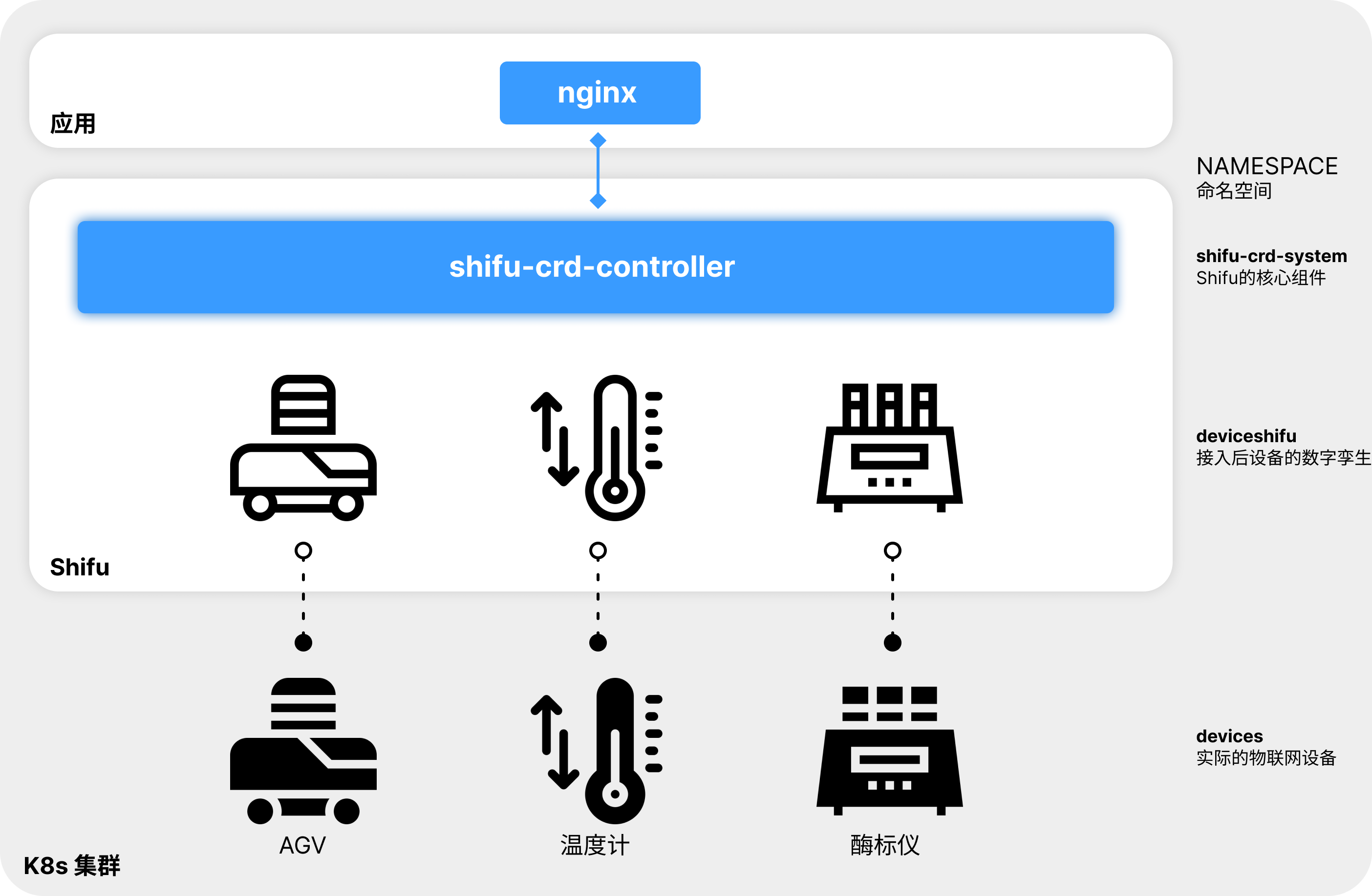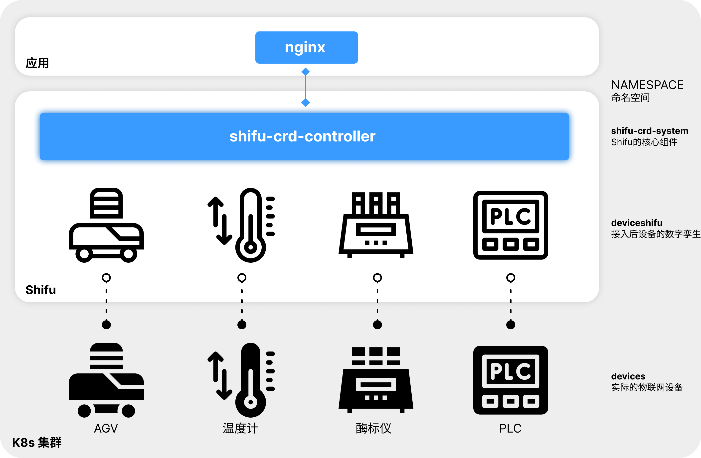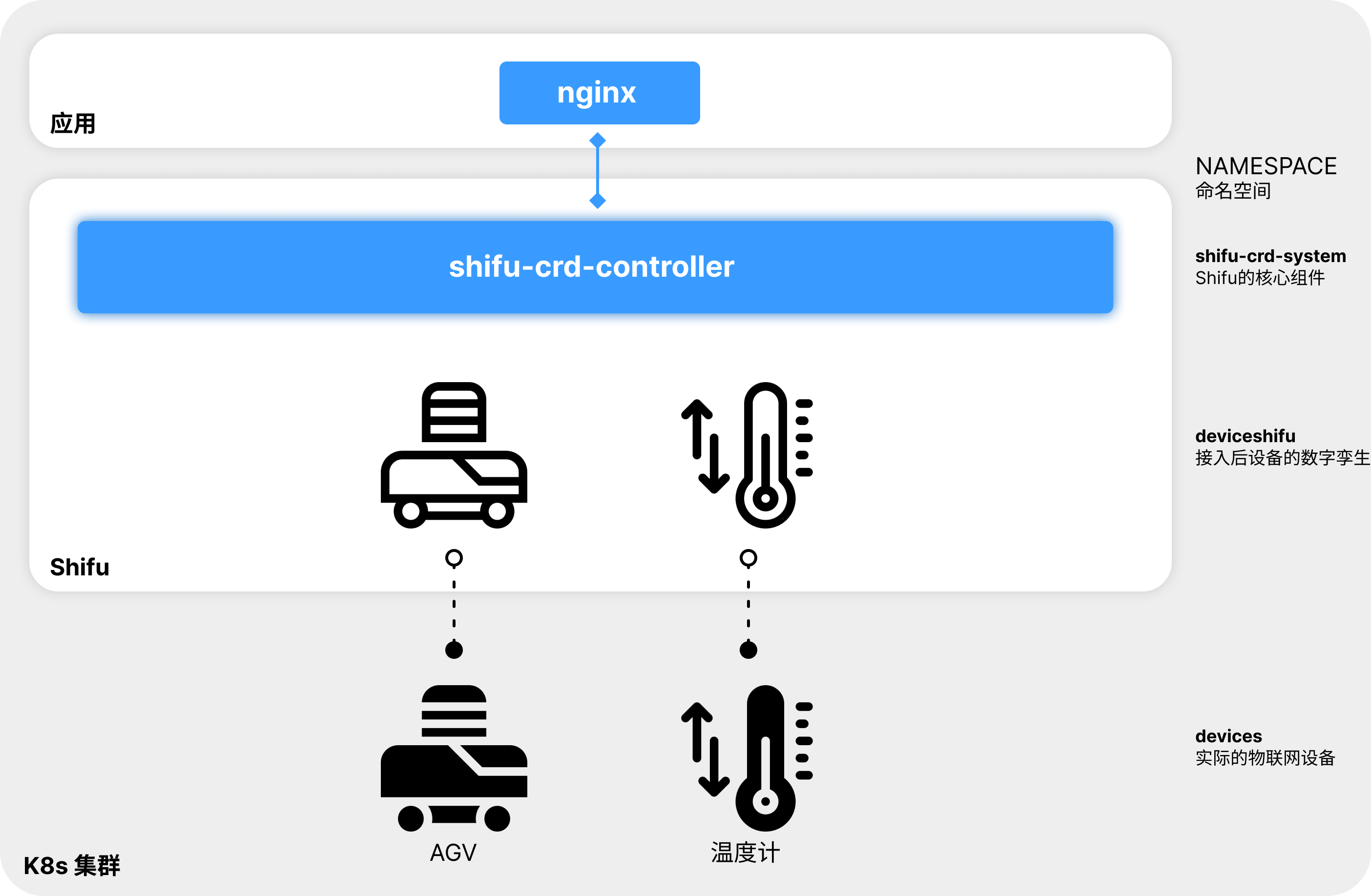 在实际的情况中,物联网设备的用户使用应用程序或者监控平台与数字孪生 deviceShifu 交互。这里 nginx 相当于一个应用程序或者一个监控平台。